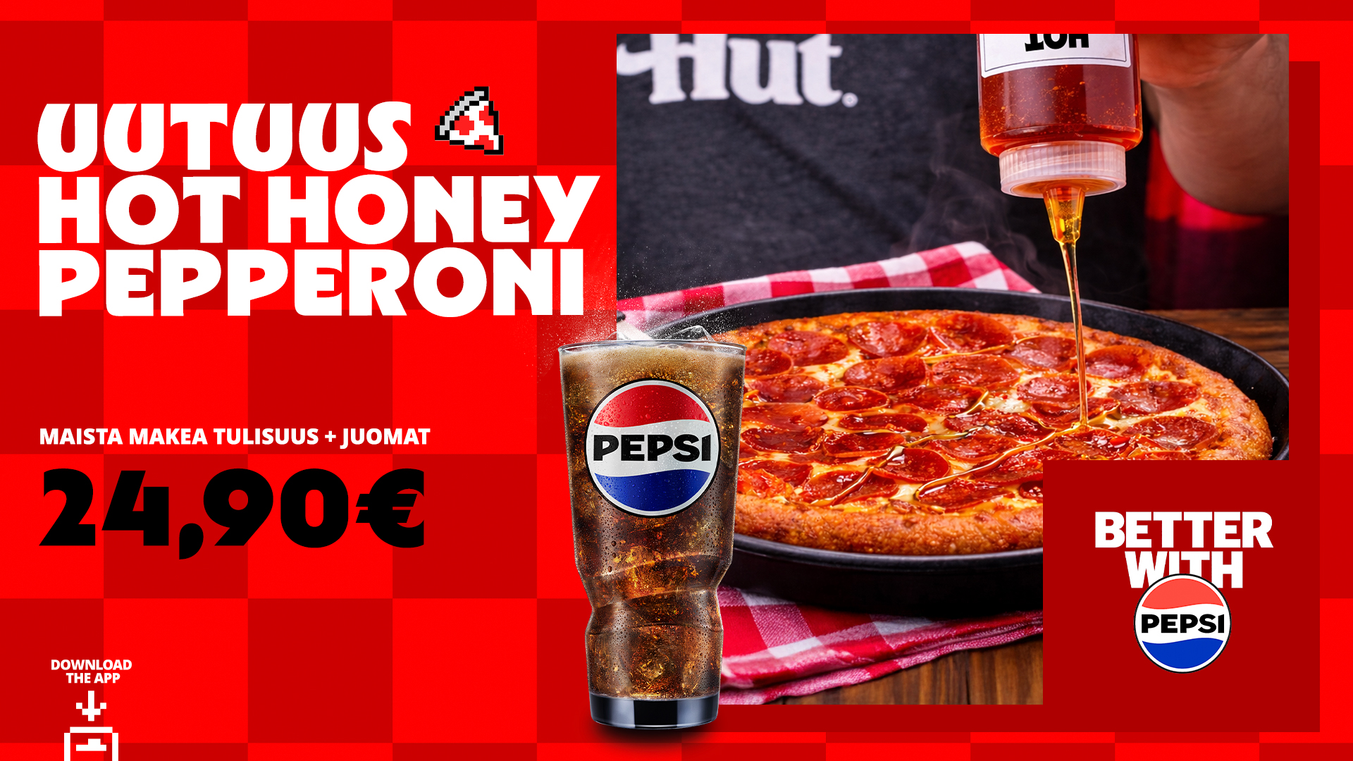 Hot Honey Pepperoni Large Pan 19,90€ – kahden Pepsin kera 24,90€