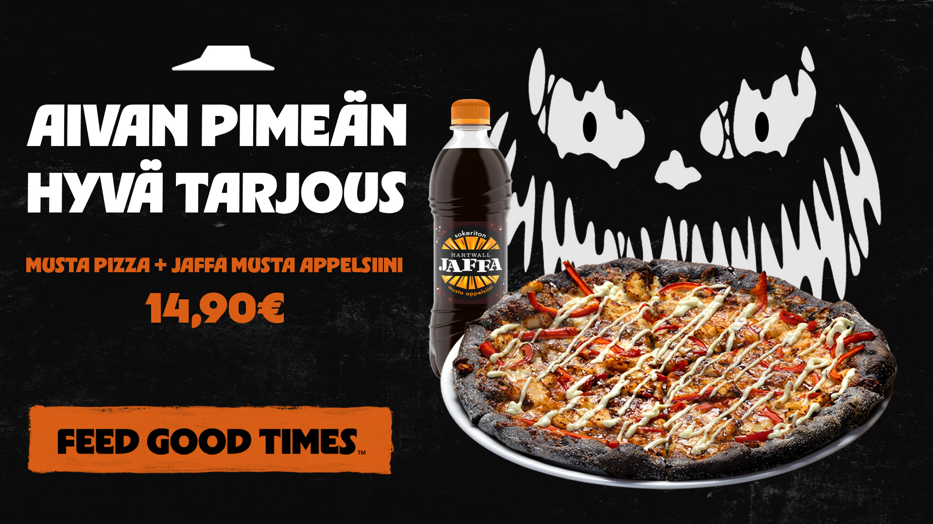 Pizza Hutin Musta pizza ei ole vahingossa uuniin liian pitkäksi aikaa unohtunut pizza, vaan musta pizzamme saa värinsä mustasta kaakaojauheesta. Herkullinen ohutpohjainen musta pizza on saatavana rajoitetun ajan, pizzaan sisältyy kolme vapaavalintaista täytettä, halutessasi lisäämme pizzan päälle valkosipulikastiketta pitämään vampyyrit loitolla…